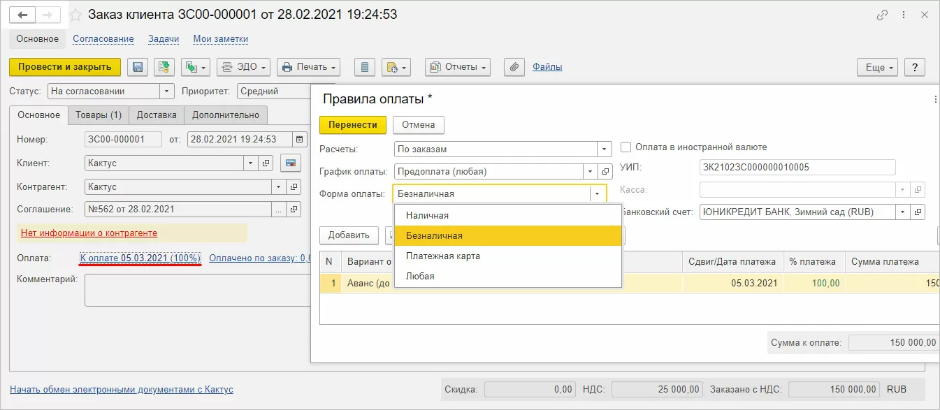 Внести изменения пользователь может по гиперссылке сведений об оплате, непосредственно в заказе клиента. Здесь же устанавливается ожидаемая форма платежа.