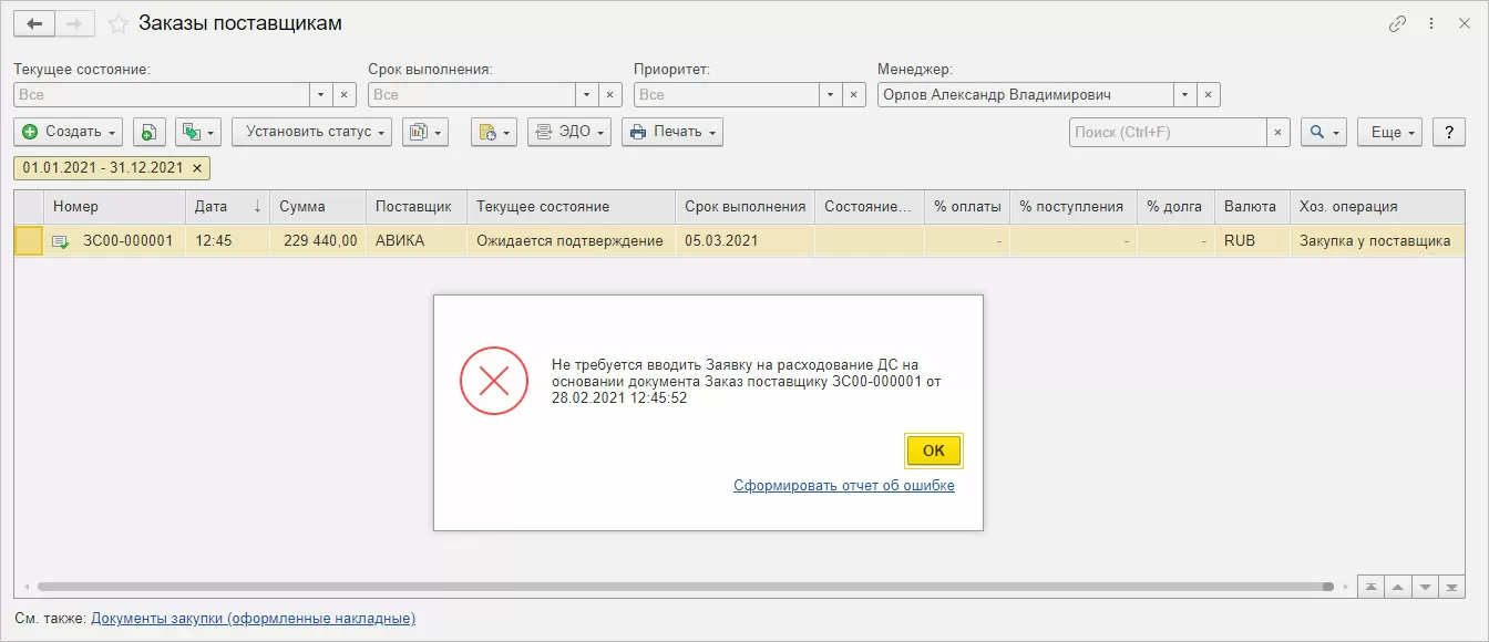 Создавая таким способом «одобрение списания», пользователь может столкнуться с сообщением программы – «Не требуется вводить Заявку на расходование ДС на основании документа Заказ поставщику …».