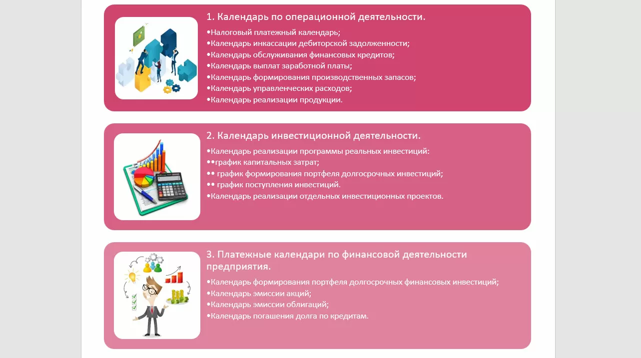 - Календарь управленческих расходов включает запланированные платежи по оплате за расходы, относящиеся к общехозяйственным (канцтовары, сервис оргтехники, расходы на командировки, представительские расходы, но не затраты на зарплату).
