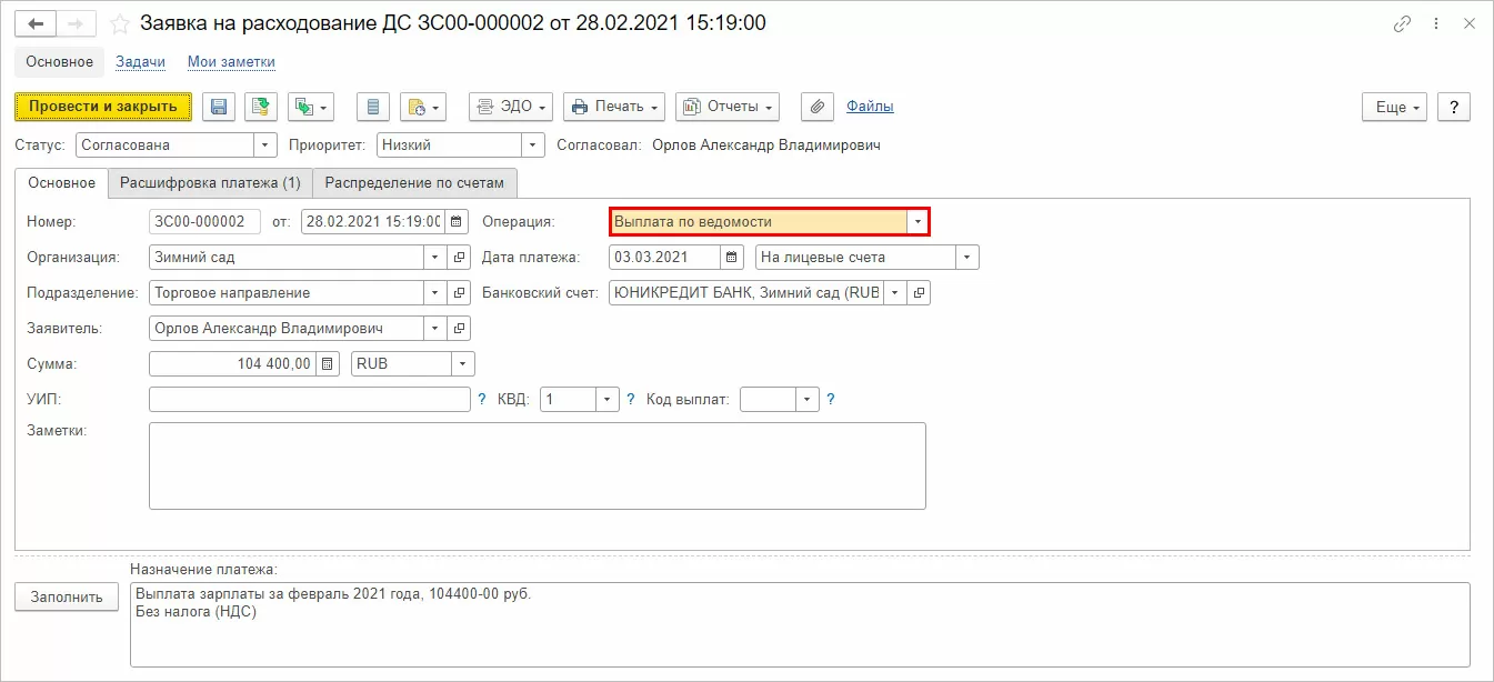 В результате сформировалась автоматически заполненная заявка на разрешение списания денег. Указан вид операции – «Выплата по ведомости».