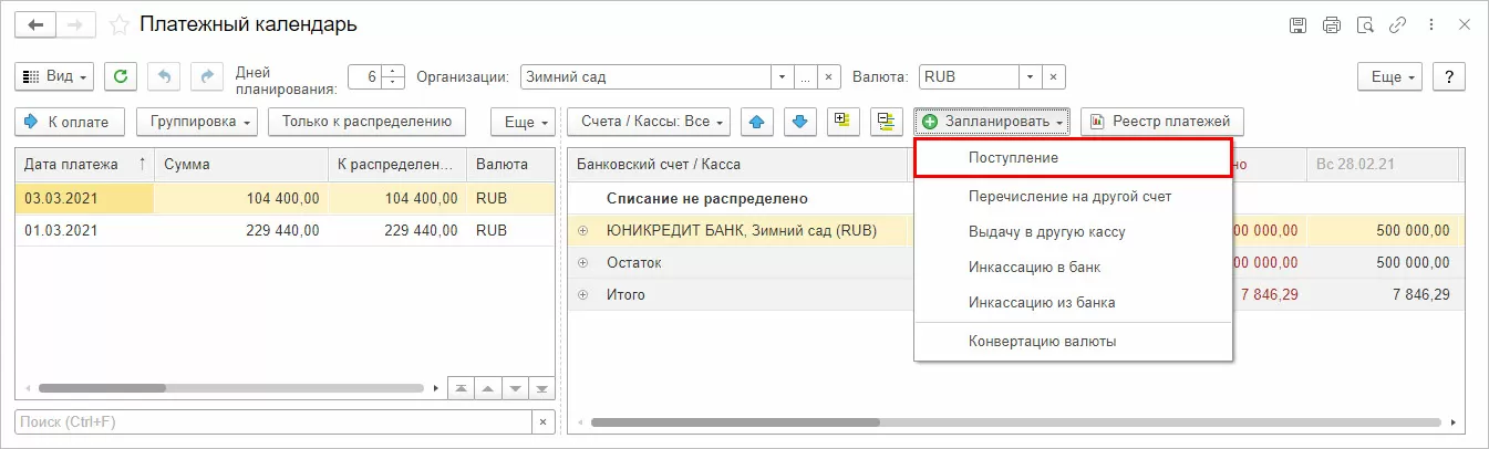 Альтернатива оформления – рабочее место «Платежный календарь», где нужно просто кликнуть «Запланировать» и выбрать нужную команду – документ. В нашем примере запланировано поступление платежа от клиента ООО «Кактус», поэтому мы выбираем команду «Поступление».