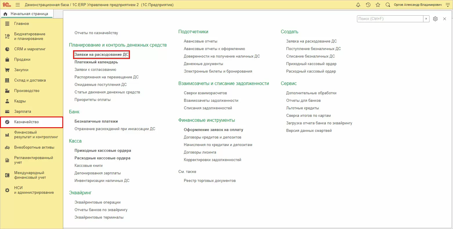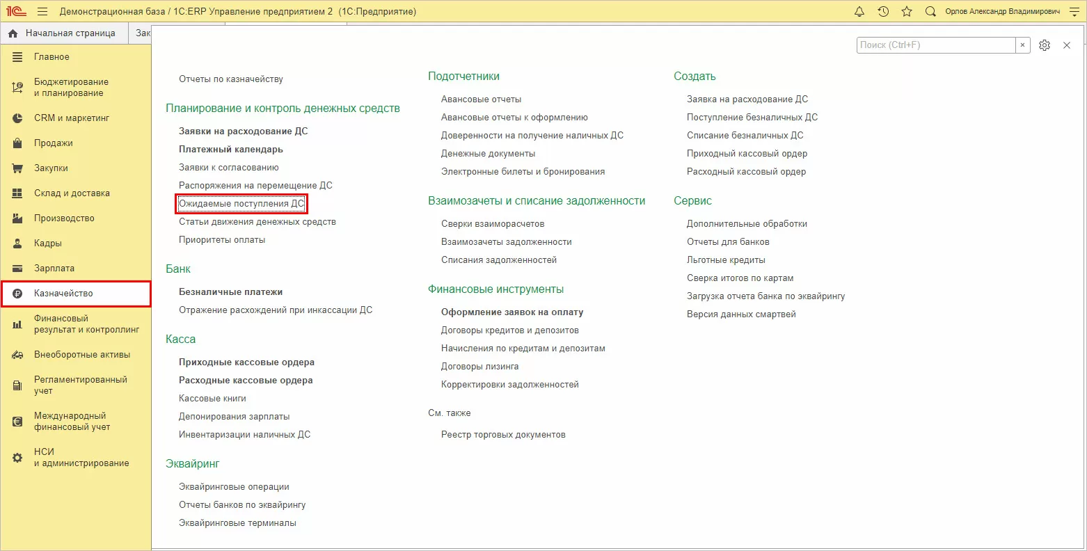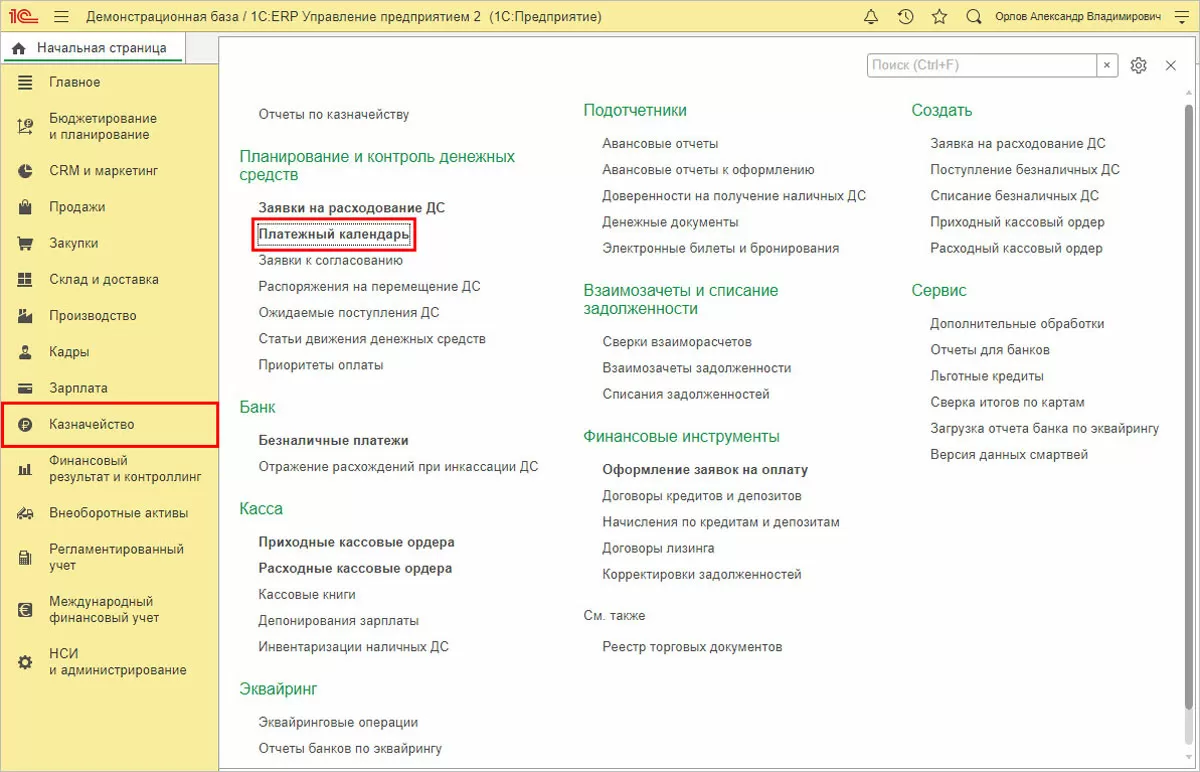Рассмотрим, что представляет собой инструмент «Платежный календарь» (далее ПК) в 1С:ERP, где для работы с этим инструментом нужно перейти в разделе «Казначейство-Планирование и контроль денежный средств».