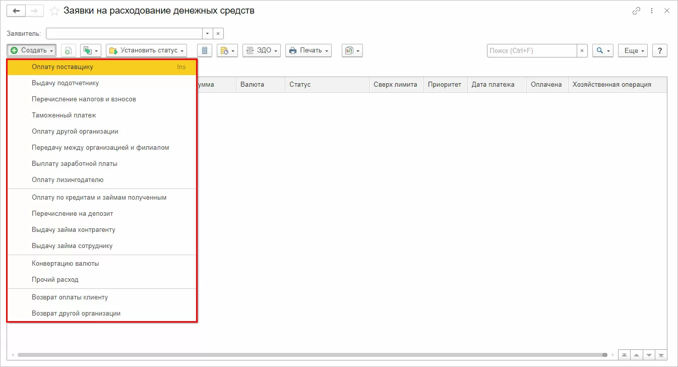 - ввести из журнала «Заявки на расходование денежных средств»;