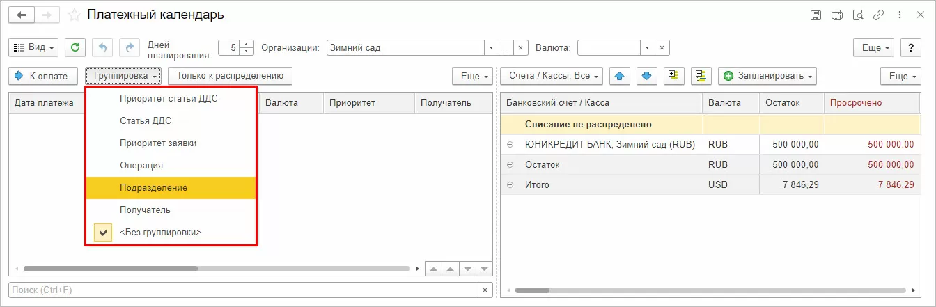 Пользователь также может задать группировку информации в календаре и отбор по источникам средств, развернув список в кнопке «Группировка» и щелкнув на вариант группировки информации: