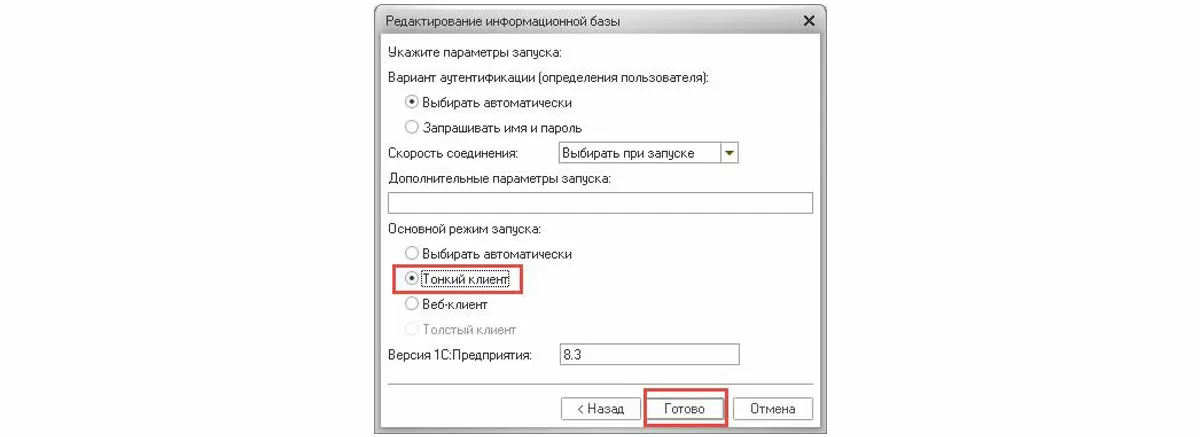 Установите переключатель «Основной режим запуска» в режим «Тонкий клиент». Жмите «Готово».