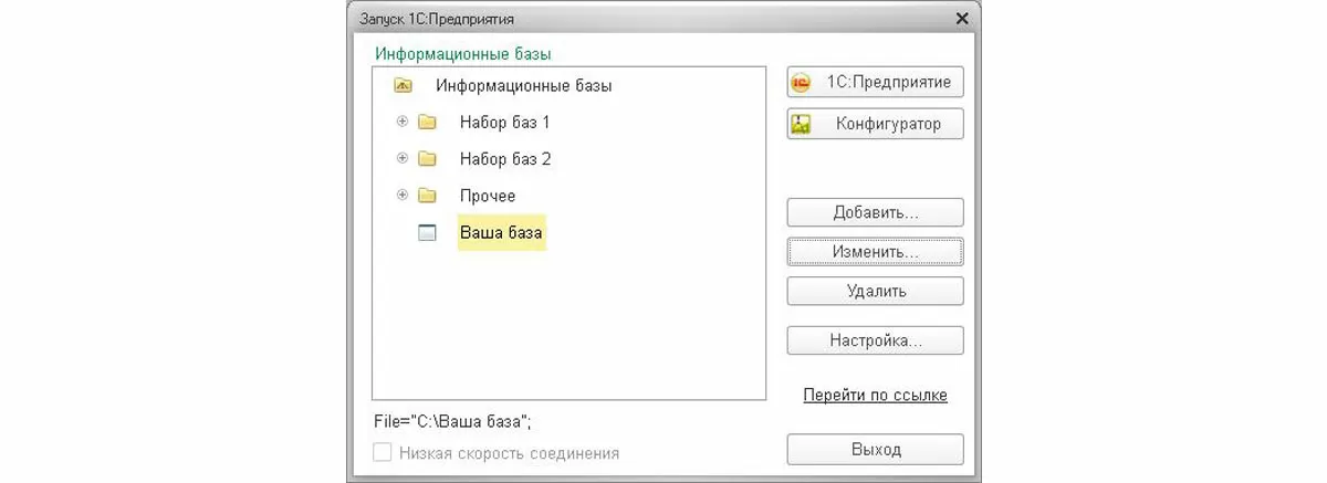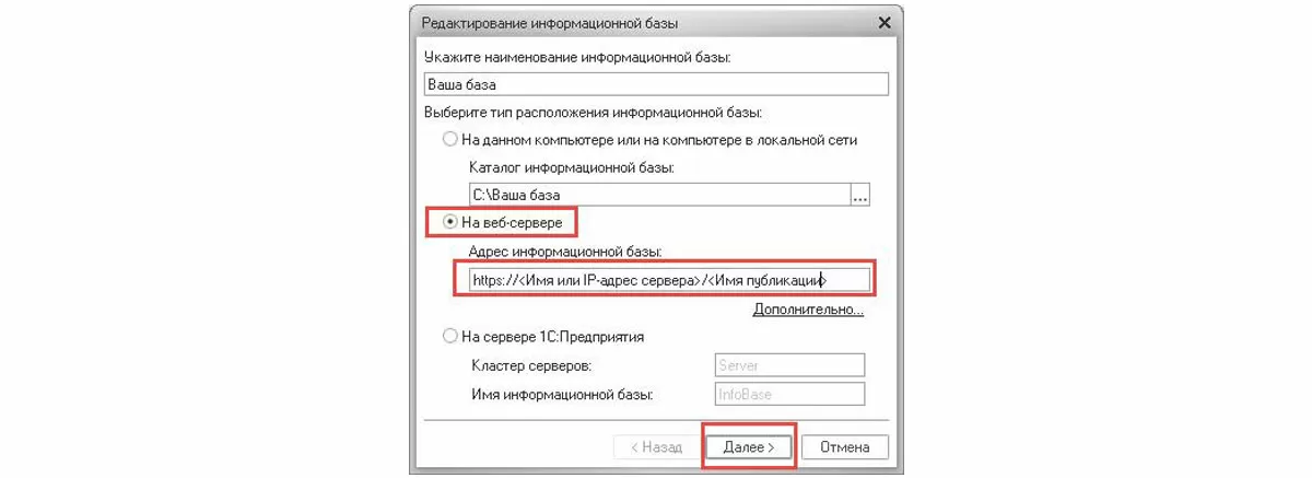 Выберите вашу рабочую базу. Здесь это «Ваша база». Нажмите «Изменить». Установите переключатель в положение «На веб-сервере», укажите в строке под ним имя или IP-адрес сервера, на котором активировали IIS, и имя под которым публиковали базу. Нажмите кнопку «Далее».