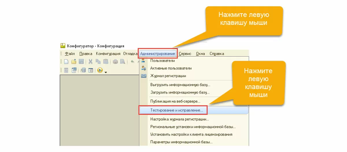 2. Выберите в главном меню пункт «Администрирование», а в нем – «Тестирование и исправление».