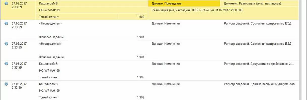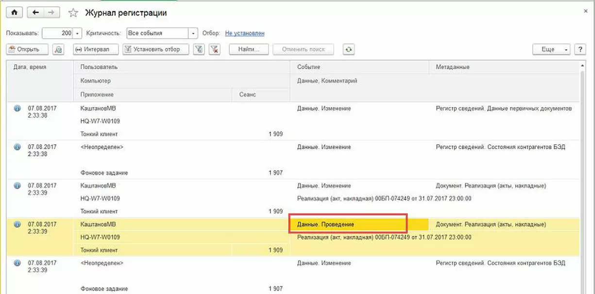 Находим нужный нам документ, в нужное время, по нужному пользователю с типом события «Данные.Проведение».