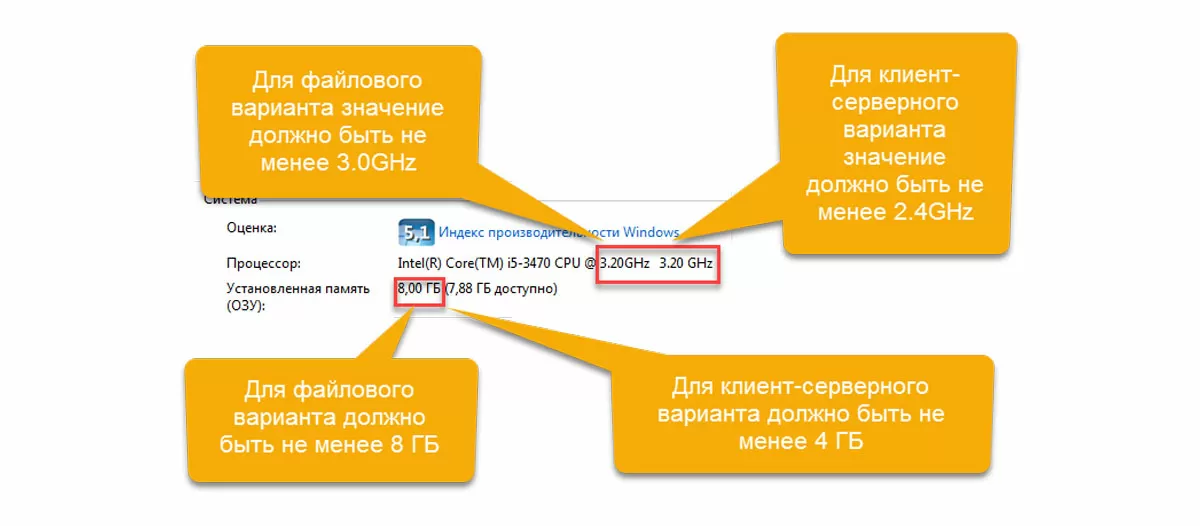 Характеристики серверов в клиент-серверном варианте рассматривать большого смысла не имеет, потому что в этом случае все зависит от количества пользователей и специфики тех задач, которые они решают в 1С.