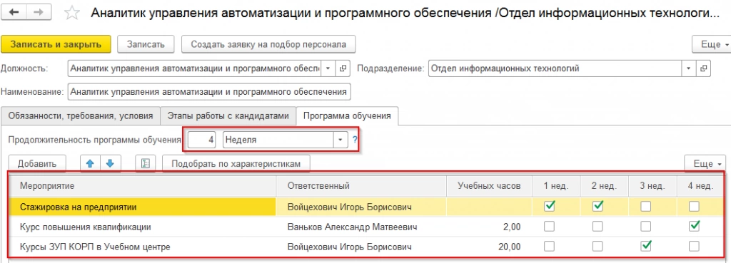 Последняя закладка – программа обучения будущего сотрудника. Здесь продолжительность и мероприятия обучения можно подбирать вручную:
