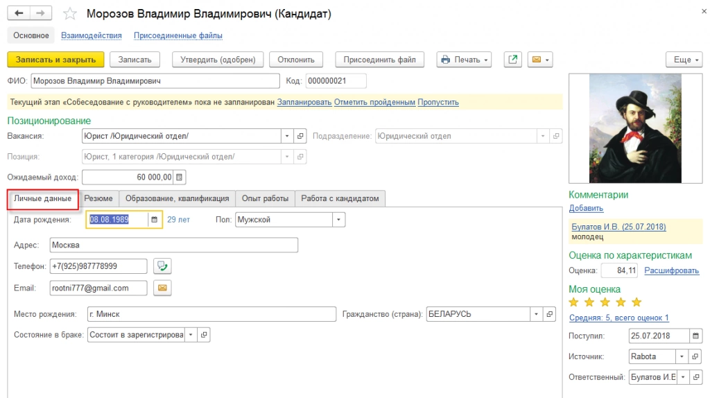 При загрузке с сайтов резюме кандидатов сразу разбивается на поля справочника «Кандидаты». На первой закладке справочника показаны общие сведения о кандидате: