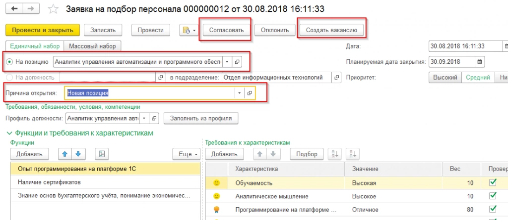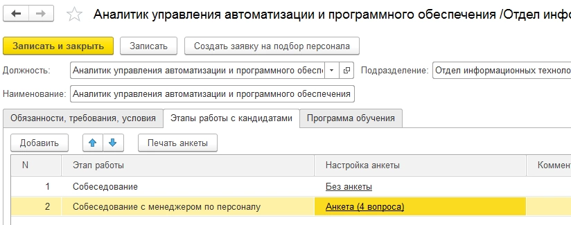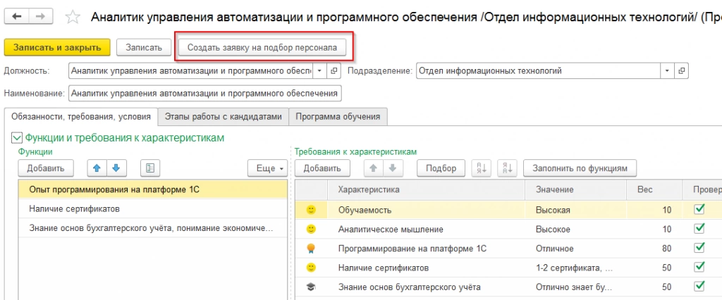 В нашем случае флажок имеется, поэтому мы должны создать заявку. Вот тут нам и понадобится созданная заранее позиция в штатном расписании:
