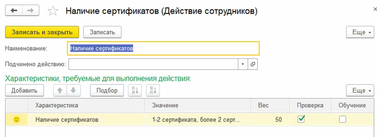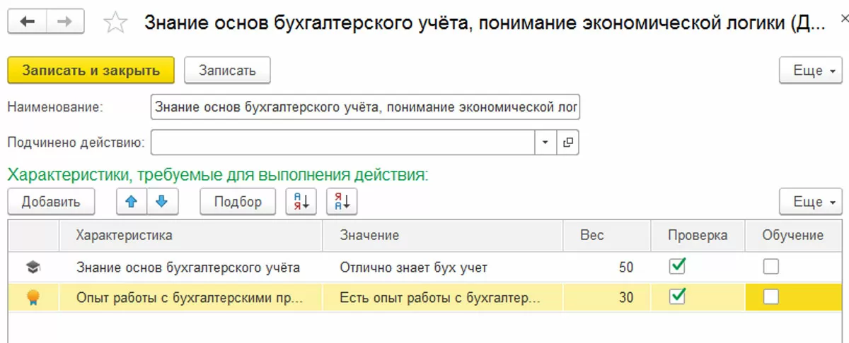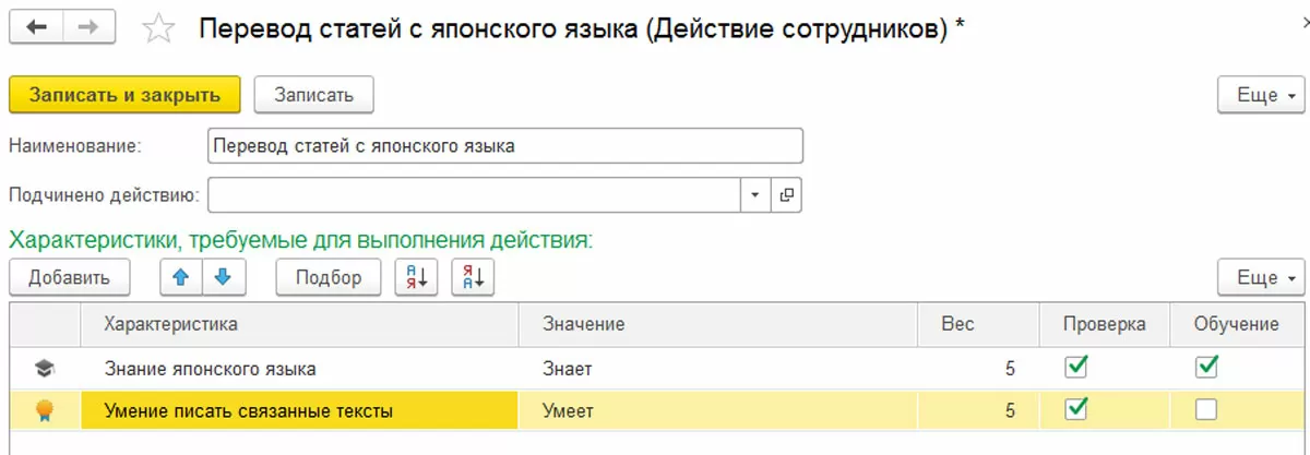 Однако библиотека не может содержать все возможные функции сотрудников, поэтому имеется возможность их создавать. Для этого нажмем кнопку «Создать» в справочнике «Действия сотрудников». В открывшейся форме справочника необходимо не только ввести наименование самого действия, но и добавить характеристики кандидата, которые необходимы для выполнения этого действия. Например, для перевода книг с иностранного языка необходимо знание этого языка и умение писать связанные тексты.