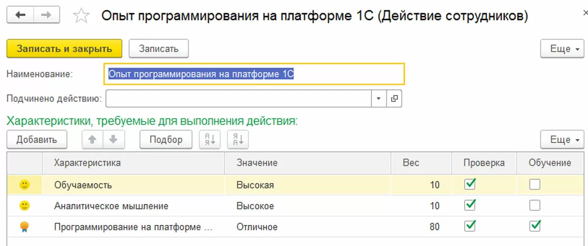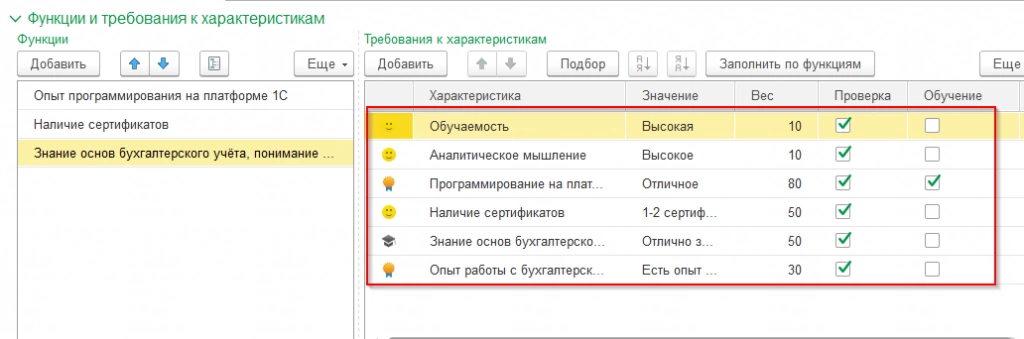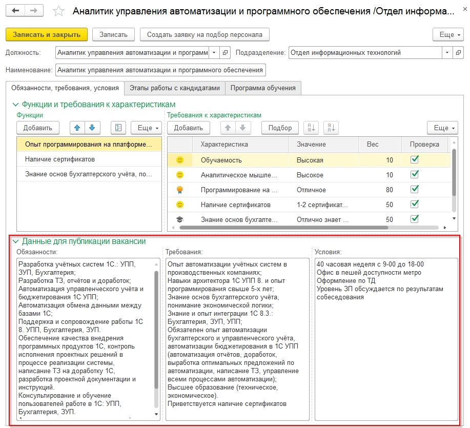 Рассмотрим вакансию «Аналитик управления автоматизации и программного обеспечения». Требование «Опыт программирования на платформе 1С» включает характеристики: