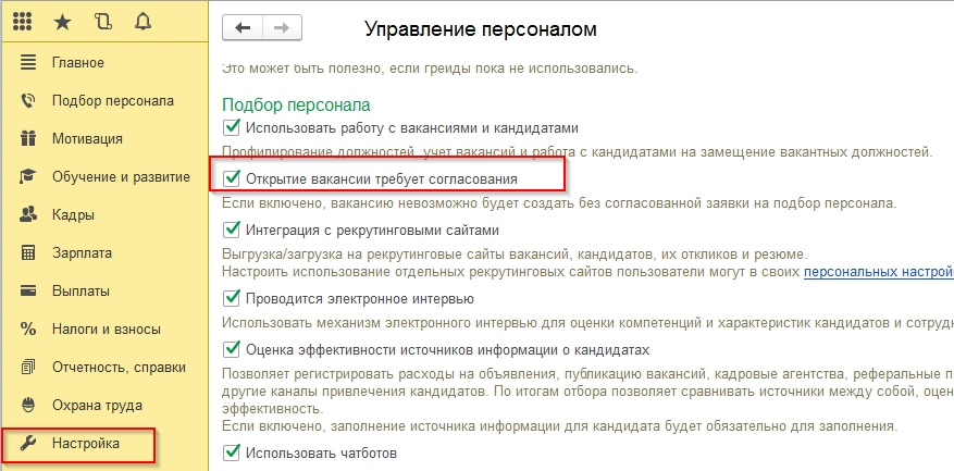 И вот тут возникает вопрос: можем ли мы сразу же создать вакансию или перед этим нужно согласовать ее создание с руководством? Легко представить себе картину: мы создали вакансию, подобрали кандидата, приняли его на работу, а за это время необходимость в данном специалисте отпала. Допустить такое никак нельзя! Этот вопрос необходимо решить до начала работы с системой. В зависимости от принятого решения нужно установить флажок в настройках: