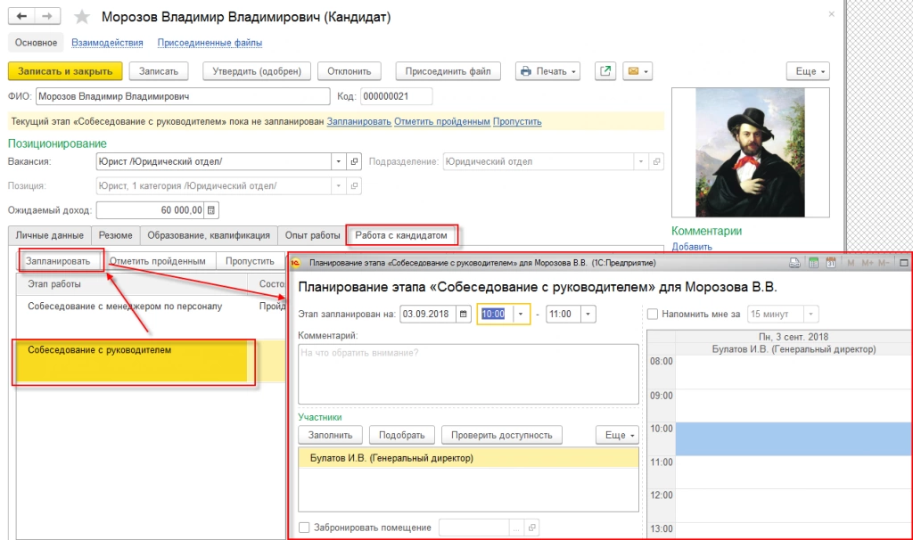 Доработаем типовой функционал подбора персонала под ваши бизнес-процессыМероприятия (встречи, собеседования) по работе с кандидатом отражаются на закладке «Работа с кандидатом». Здесь имеется возможность запланировать мероприятие по работе с конкретным кандидатом: