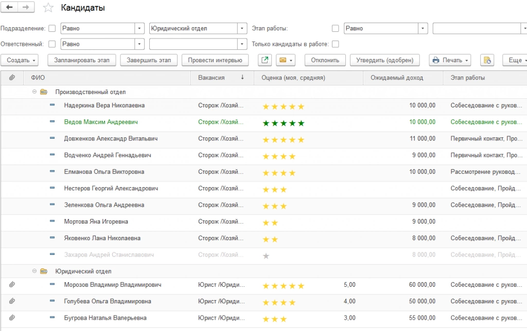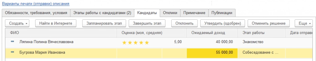 Здесь можно запланировать мероприятие, провести интервью. Можно даже утвердить или отклонить кандидата. Все эти функции выведены на кнопки в верхней части формы списка.