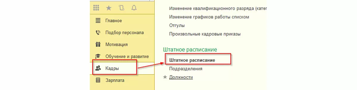Если вакансия возникает одновременно с новой должностью в штатном расписании, необходимо ввести позицию штатного расписания (ПШР). Штатное расписание находится в разделе «Кадры»: