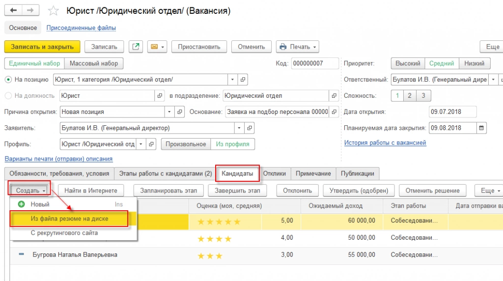 Чтобы загрузить его в систему, необходимо, находясь в вакансии, перейти на закладку «Кандидаты», а затем «создать» нового кандидата «Из файла резюме на диске»: