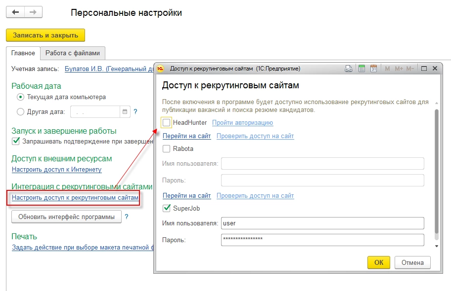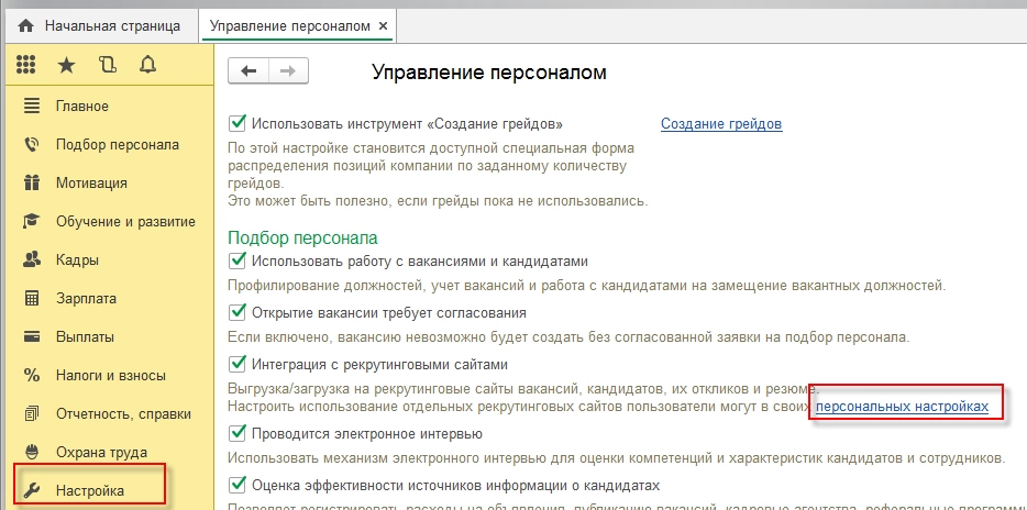 Для возможности поиска кандидатов на этих сайтах необходимо пройти регистрацию. Последовательность действий: Настройка - Управление персоналом - Раздел «Подбор персонала» - персональные настройки: