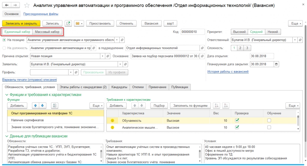 Обратите внимание на переключатель «Единичный набор/массовый набор». Массовый набор – набор на несколько позиций штатного расписания. Пока остановимся на единичном наборе.