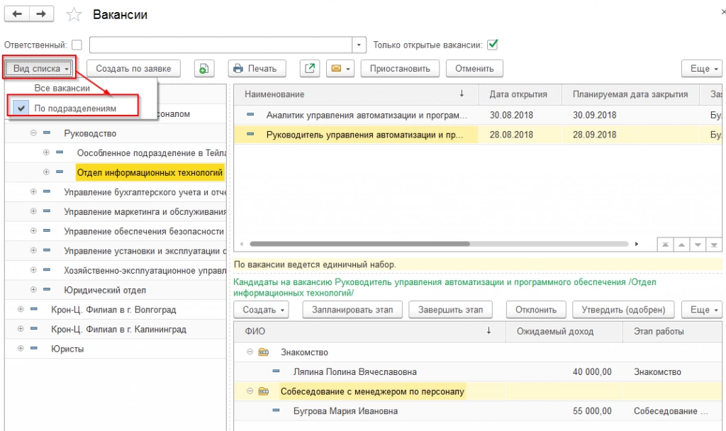 Очень удобен просмотр кандидатов в списке вакансий. При выборе вида списка «По подразделениям» видны вакансии, имеющиеся в подразделении, а также кандидаты на выделенную должность. Кроме того, выводятся этапы работы по каждому кандидату: