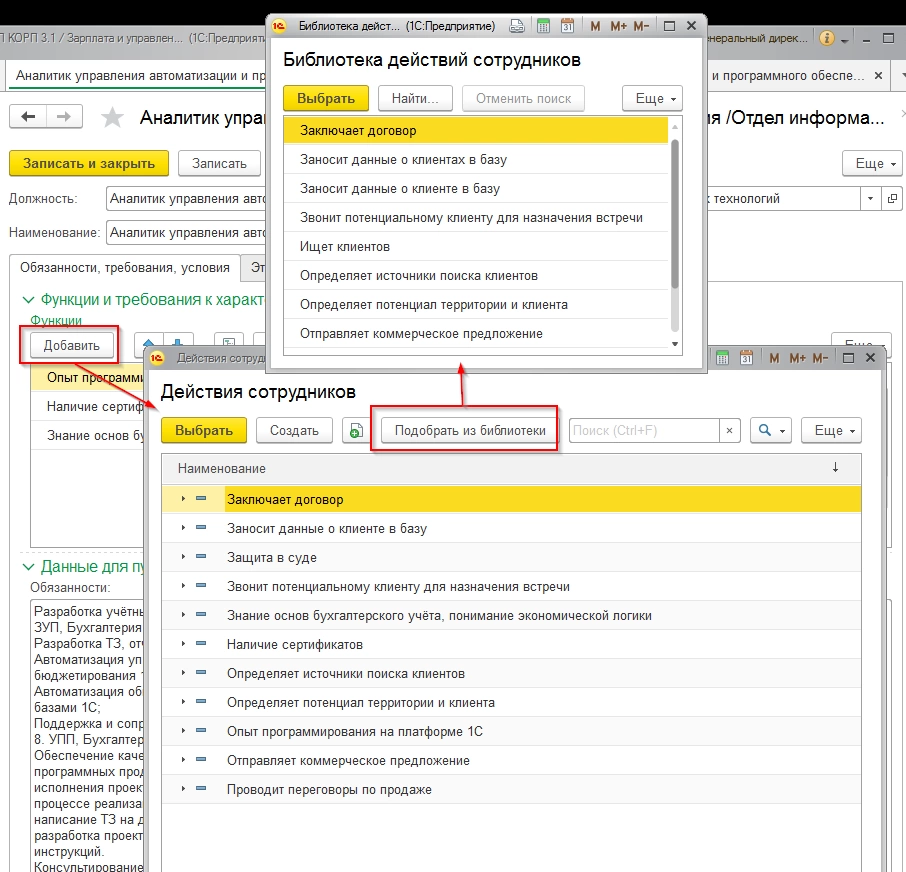 Обязанности, требования и условия мы видим в нижней части формы. Выше, в левой части экрана располагаются функции, которые должен будет выполнять будущий сотрудник. При заполнении профиля должности их можно выбрать из справочника. А для заполнения этого справочника можно использовать готовый перечень, который открывается по кнопке «Подобрать из библиотеки».