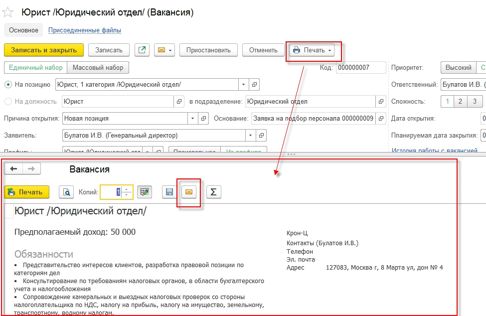 Вакансию можно распечатать или отправить по почте прямо из справочника вакансий: