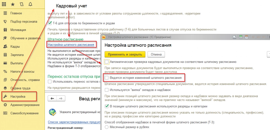 Изменить эту настройку можно в разделе «Настройка» - «Кадровый учет» - «Настройка штатного расписания» – Флажок «Ведется история изменений штатного расписания»: