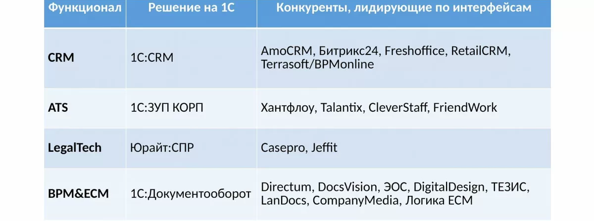 Помимо этого существует целый класс функциональных задач, где 1С проигрывает как система: в области CRM и систем рекрутинга (ATS), в LegalTech для судебной работы юристов, в BPM (даже несмотря на то, что 1С:Документооборот сегодня – одна из флагманских систем 1С, она проигрывает конкурентом в юзабельности), и т.д.