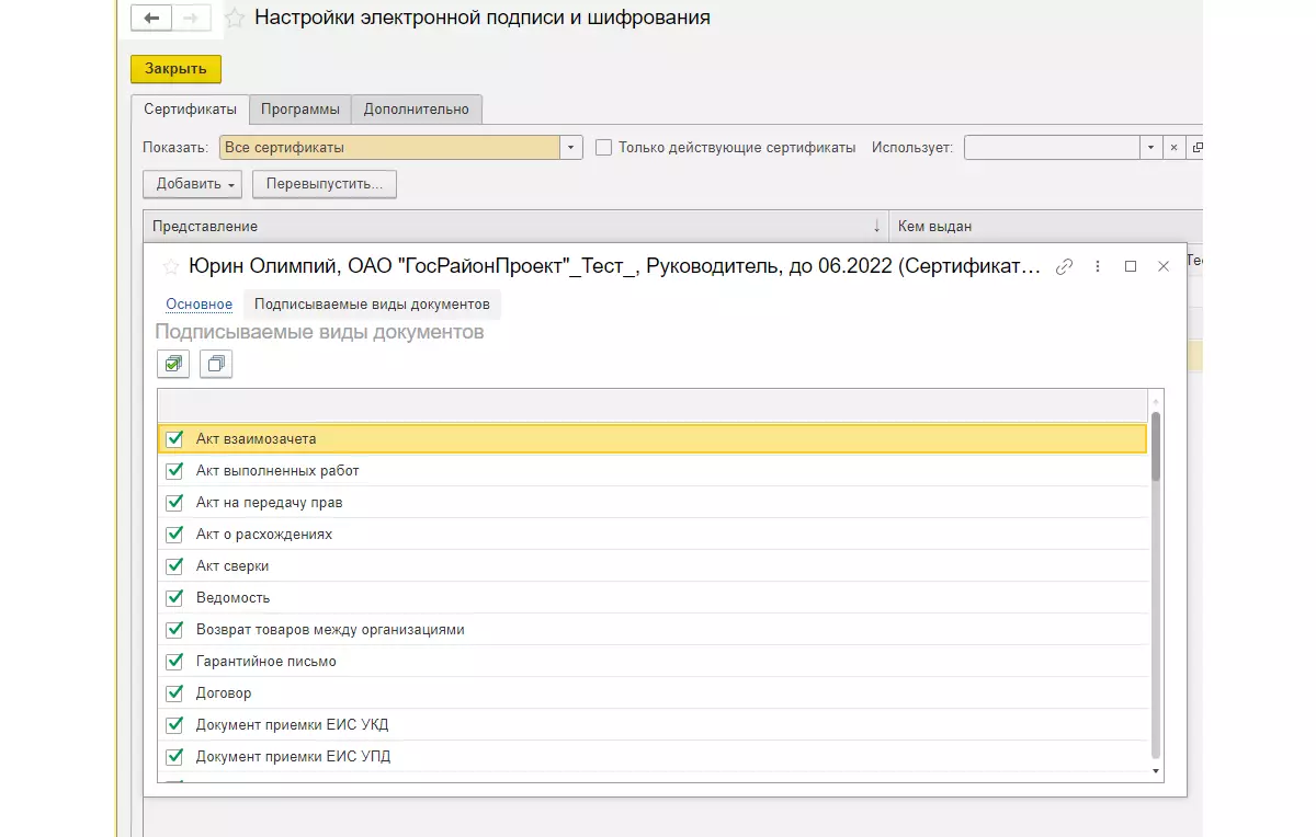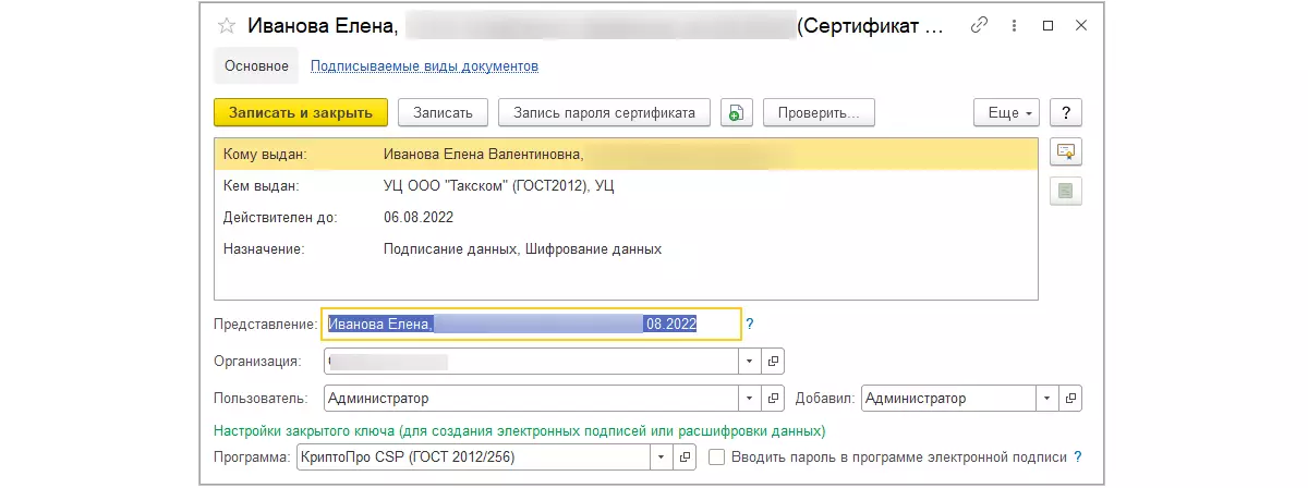 В карточке сертификата необходимо прописать связь с организацией, указать виды подписываемых документов (по умолчанию в конфигурациях либо проставлены все галочки, либо они вовсе отсутствуют).