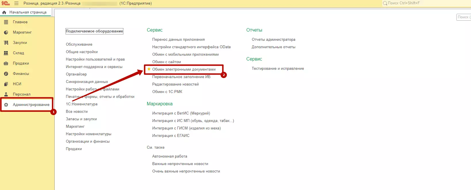 - Убедиться в актуальности версии программы 1C и в разделе Администрирование выбрать Обмен электронными документами.