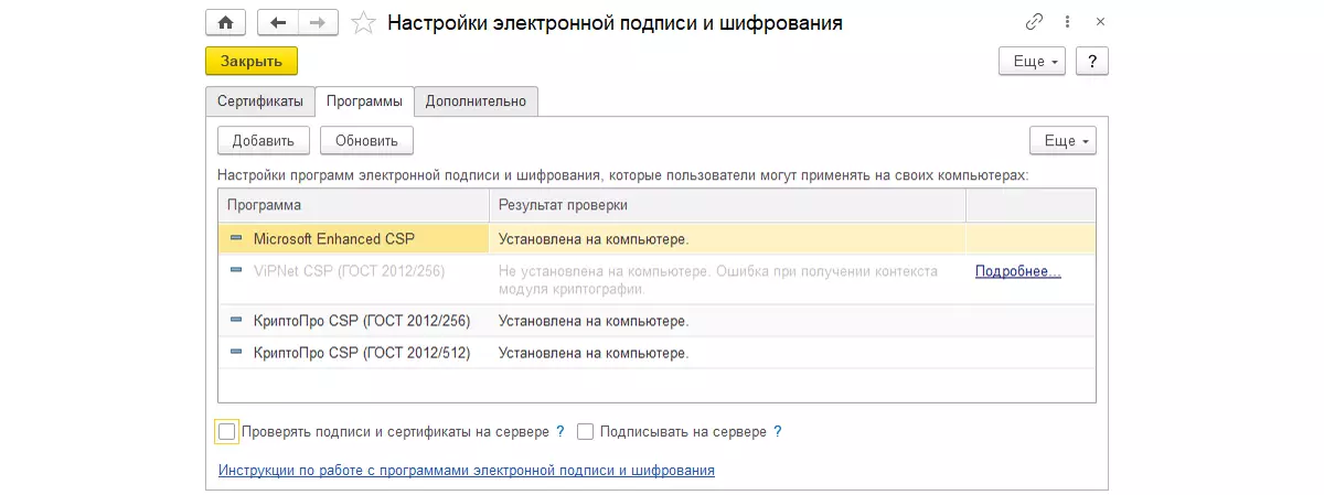 На закладке Программы необходимо выбрать из списка доступных программ криптопровайдер для работы с сертификатом. Для клиент-серверной архитектуры в форме Настройки электронной подписи и шифрования на закладке Программы рекомендуется установить флажки Проверять подписи и сертификаты на сервере и Подписывать на сервере.