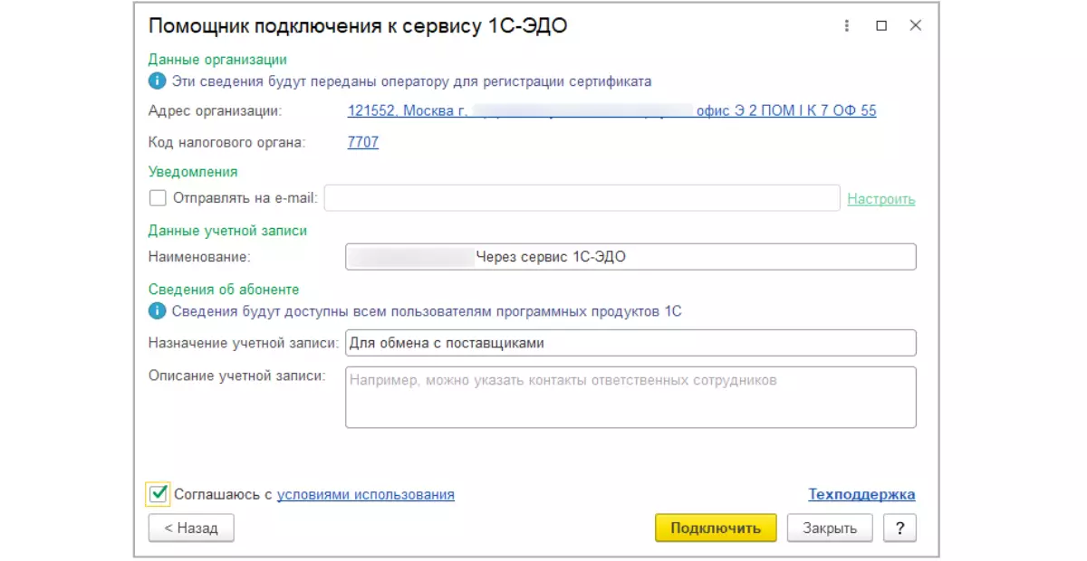 Обязательно заполнить назначение учетной записи по 1С-ЭДО и поставить галочку согласия с условиями. В любой конфигурации на платформе «1С:Предприятие» профиль настроек ЭДО можно завести с помощью помощника подключения к сервису: