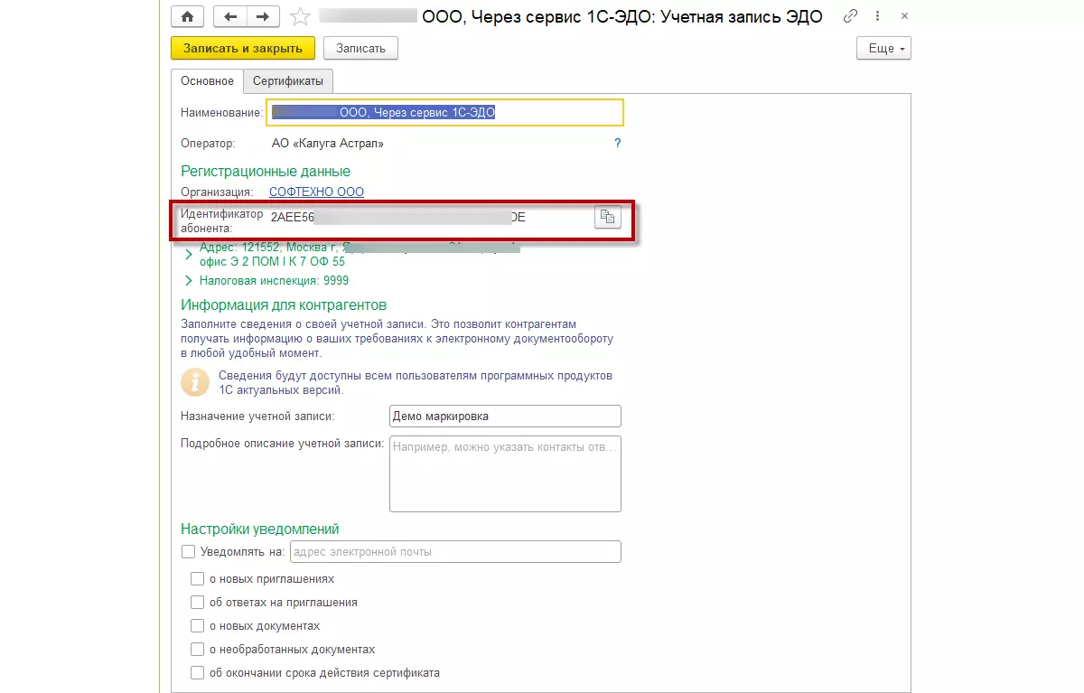 На следующем шаге помощник попросит указать код налогового органа и электронную почту для получения уведомлений. Если все настройки выполнены верно, то по команде Подключить оператор ЭДО присвоит уникальный идентификатор для данной учетной записи.