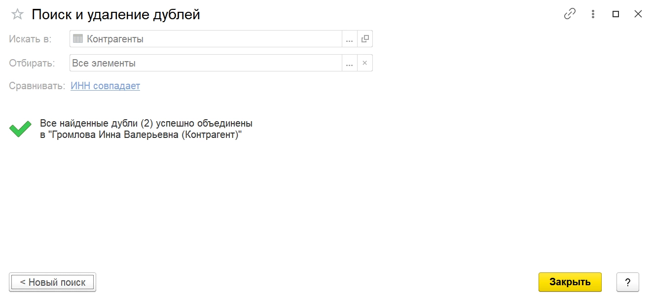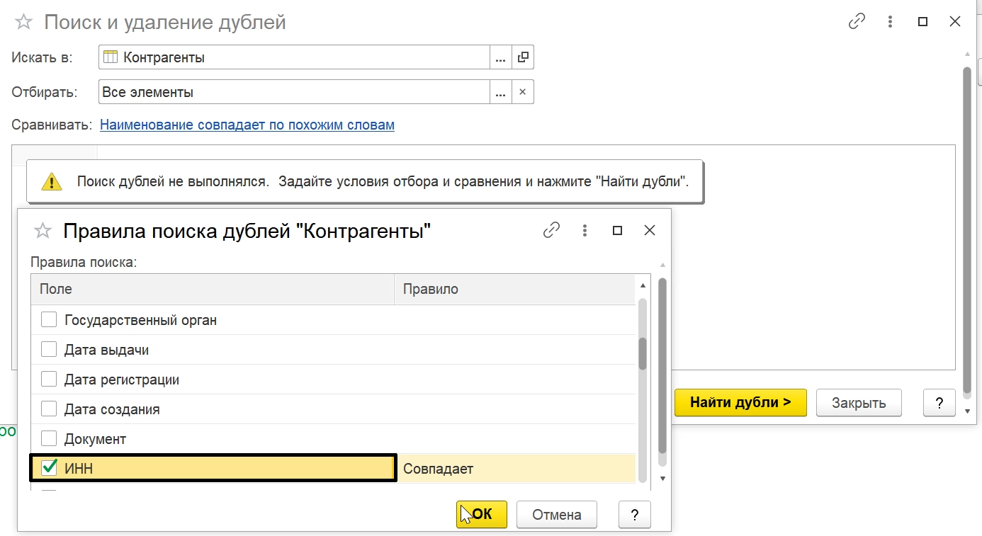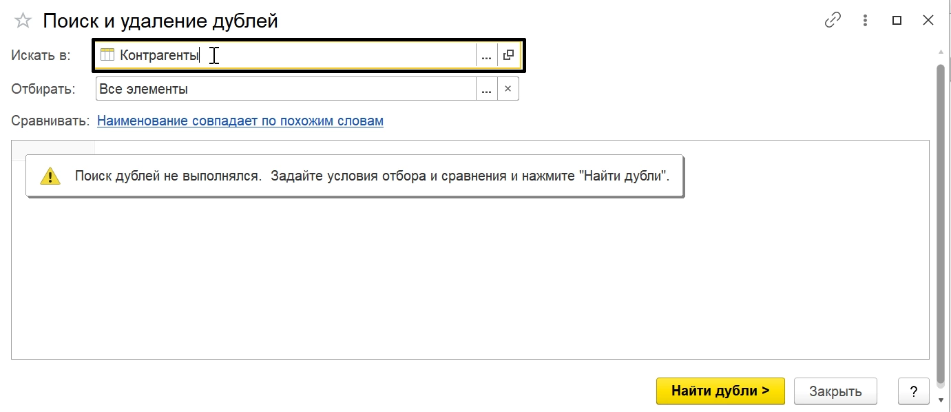 Перейдя по гиперссылке в поле «Сравнить», задаем правила поиска дублей для выбранного объекта. По умолчанию установлен поиск по наименованию – по схожим словам. Но пользователь может написать разные наименования, например, полное и сокращенное – ИП или Индивидуальный предприниматель, полные данные контрагента (физического лица) – фамилию, имя, отчество, или указать только инициалы.
