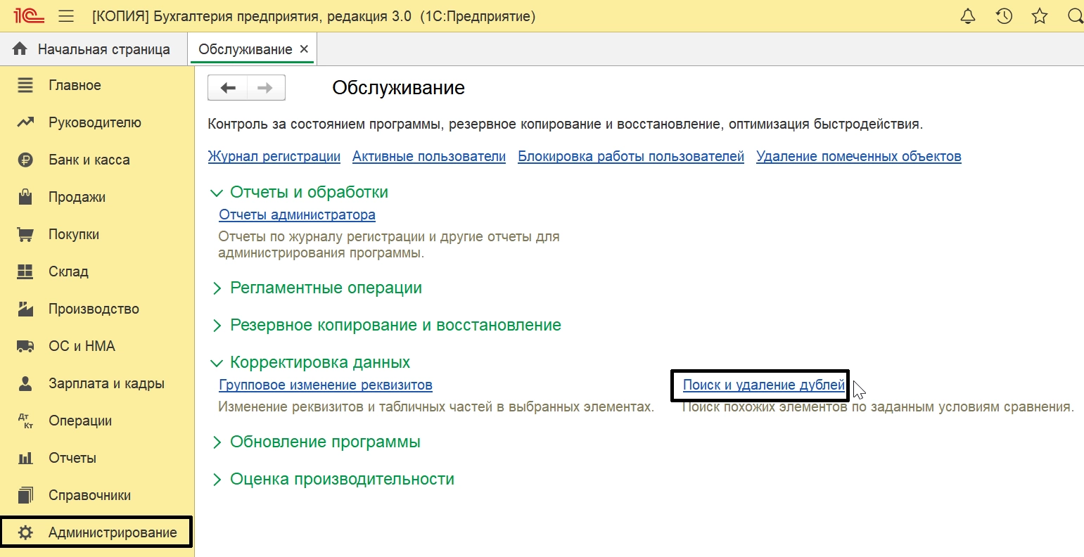 Открыть обработку можно в разделе меню «Администрирование» - «Обслуживание» перейдя по гиперссылке «Поиск и удаление дублей».