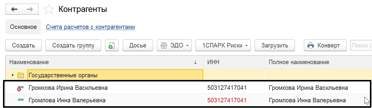 Посмотрим, что же происходит с ними в справочнике. Зайдем в справочник «Контрагенты» (раздел меню «Справочники» - «Покупки и продажи»). Дубль-двойник помечен на удаление. Помимо этого мы видим, что контрагент был внесен дважды, но с разным наименованием. Внимательный пользователь бы заметил, что ИНН у элемента двойника выделен красным цветом. В программе имеется контроль совпадений контрагентов по ИНН.
