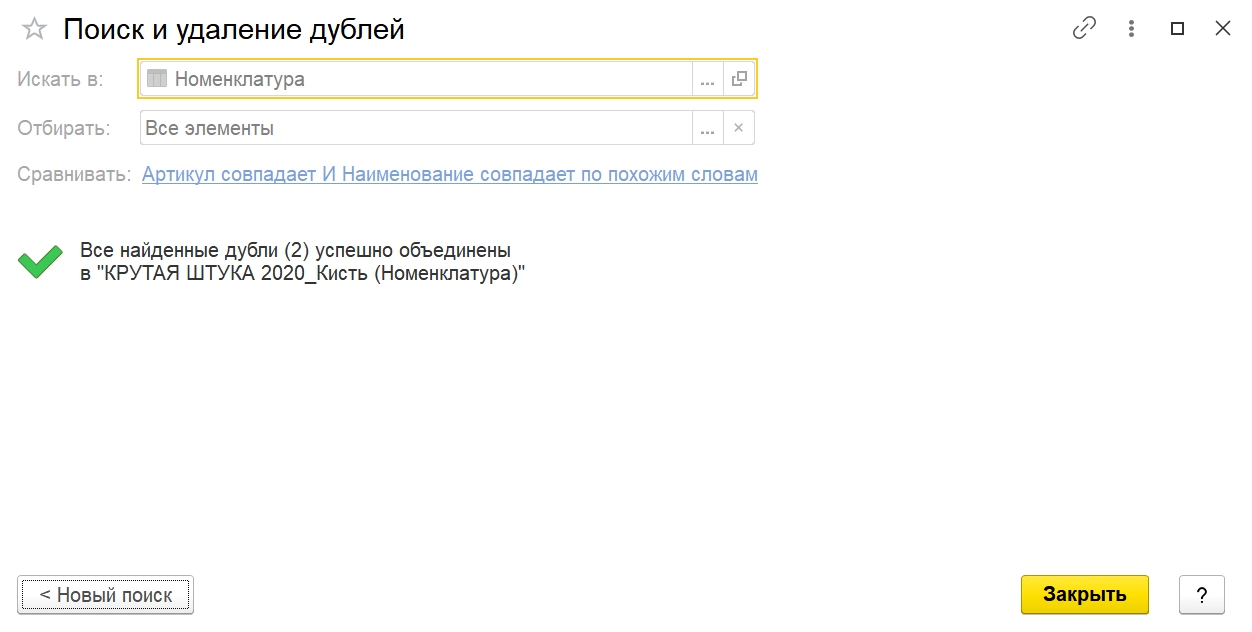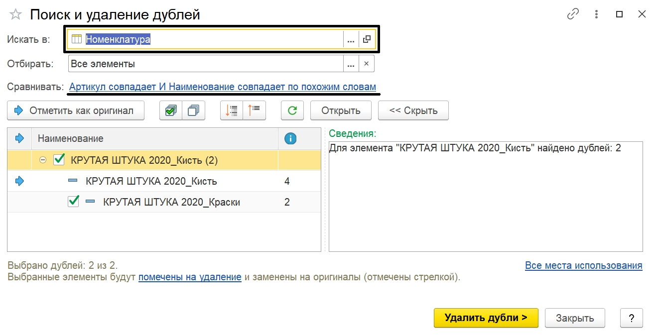 Для примера найдем дубли элементов в справочнике «Номенклатура», проведя сравнение по артикулу и наименованию.