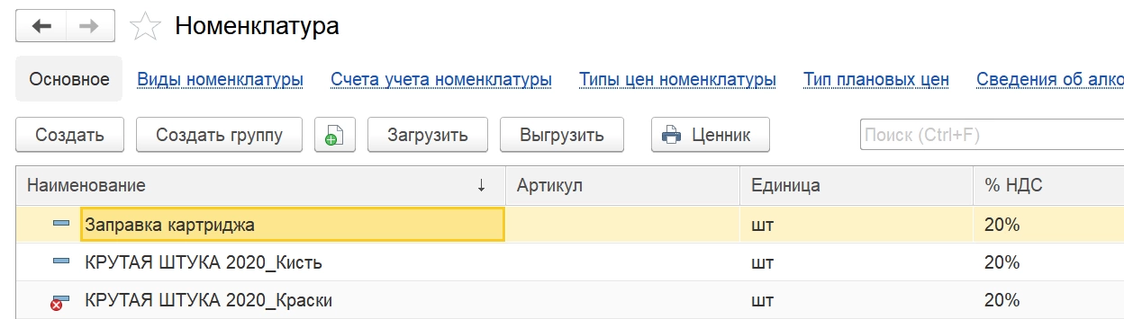 Перейдя в справочник «Номенклатура» (раздел меню «Справочники» - «Покупки и продажа»), выполним поиск по наименованию, т.к. зрительно похожее название почему-то не отображалось. Что мы видим? У одного из элементов справочника перед названием стоит пробел – именно поэтому пользователь не может увидеть этот элемент в списке, просматривая его в алфавитном порядке. Все символы идут обычно в начале списка. Не найдя этот элемент, пользователь создал новый. Такая ситуация встречается довольно часто.