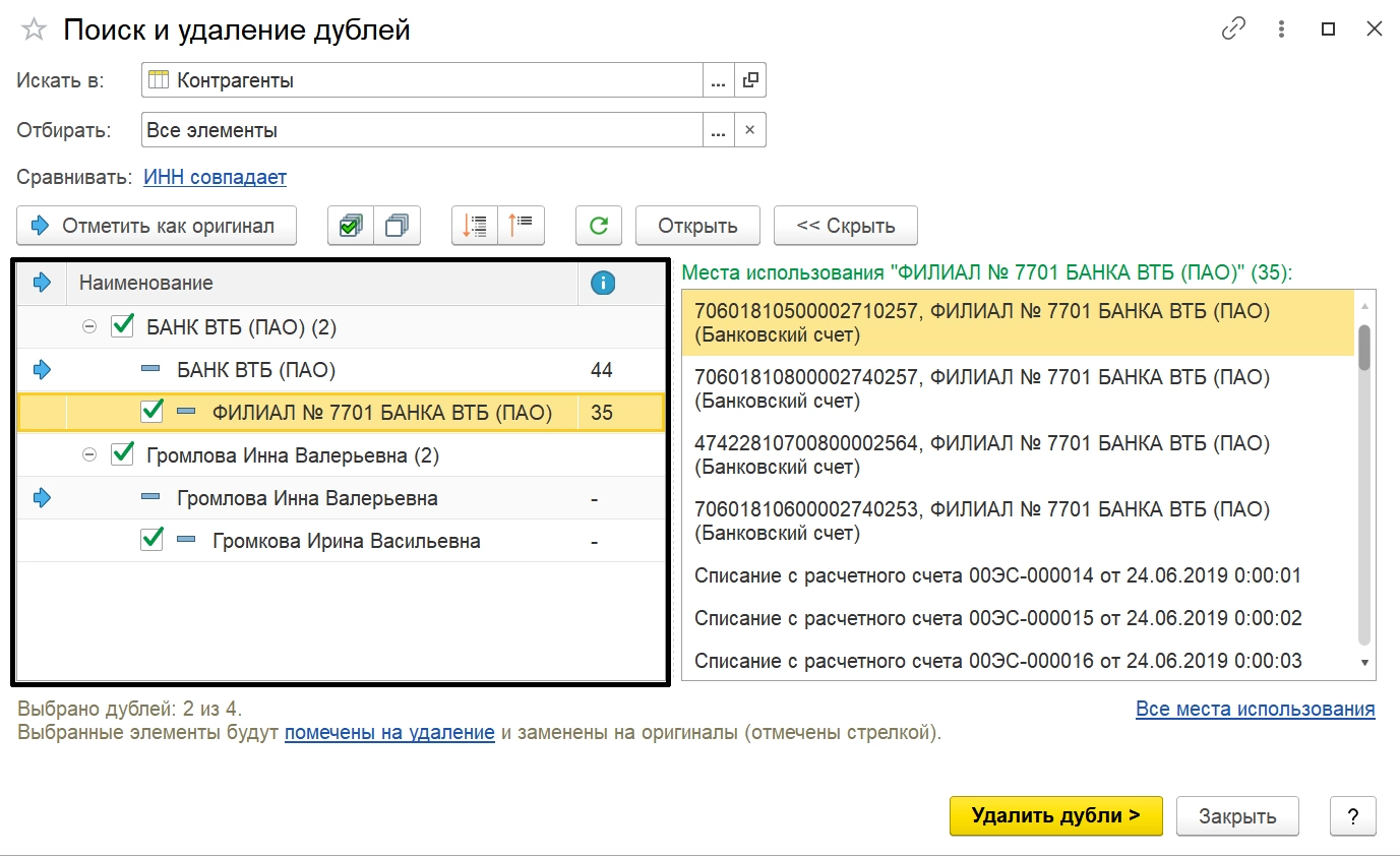 После нажатия кнопки «Удалить дубли» программа перенесет все объекты, где был задействован элемент-двойник, на отмеченный объект-оригинал, тем самым объединив их.