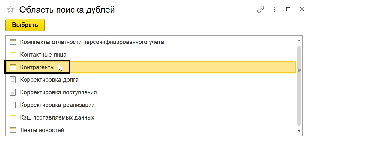 Из предложенного списка выбираем нужную область поиска дублей. В нашем примере проверим сначала справочник «Контрагенты».