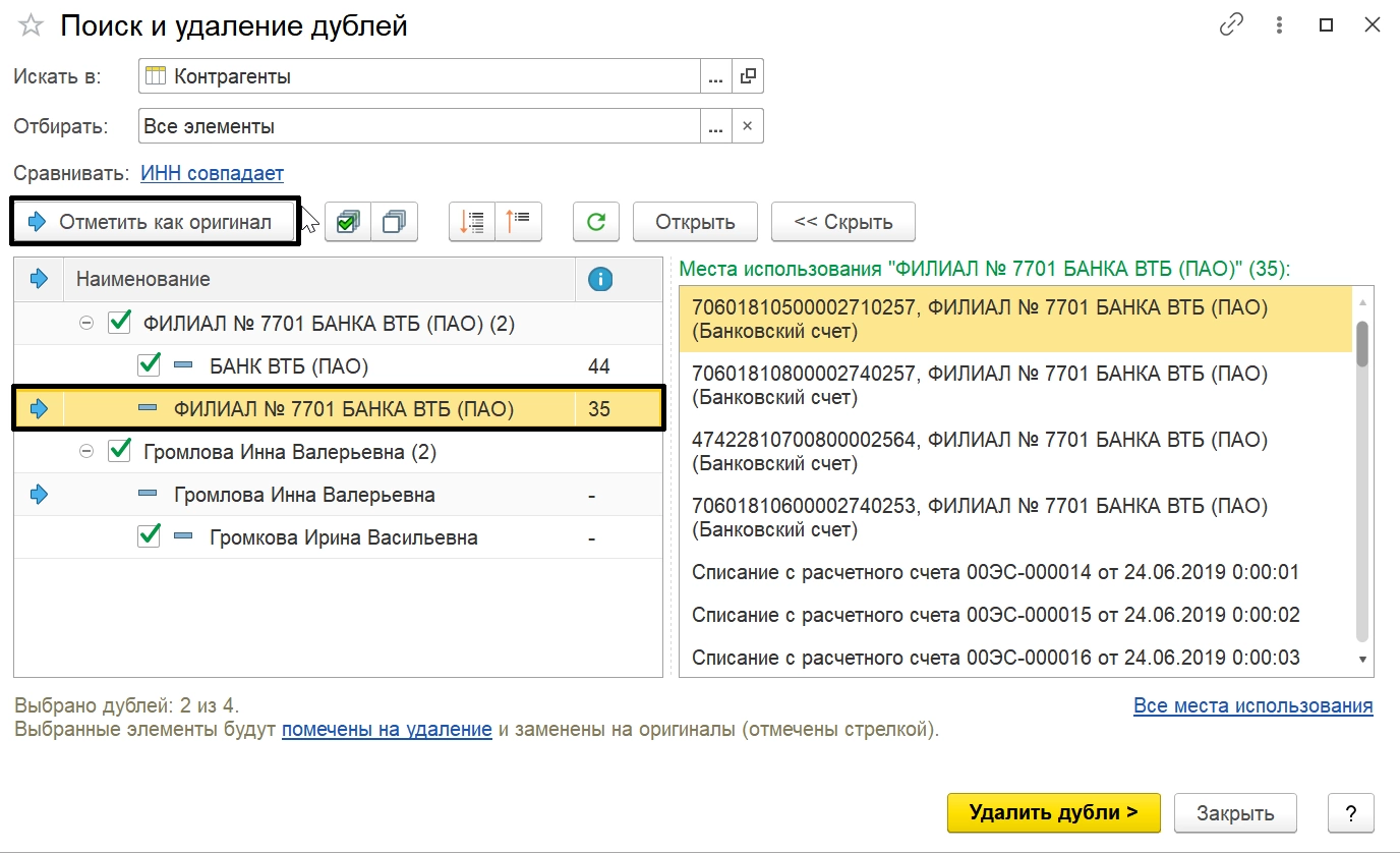 Элемент с наибольшим количеством записей программа автоматически определяет как оригинал, выделив его синей стрелочкой. Если какой-то из объектов мы обрабатывать не будем, галочку с него надо снять. Или если мы хотим изменить объект, на который будут перенесены все данные с другого объекта при его удалении, то отметим его, нажав кнопку «Отметить как оригинал».