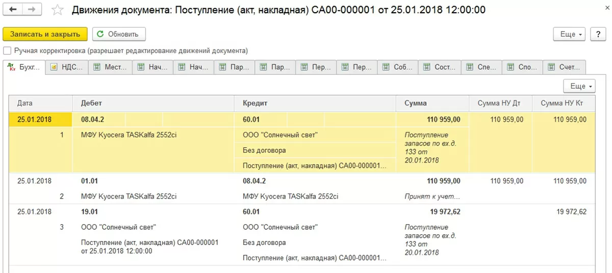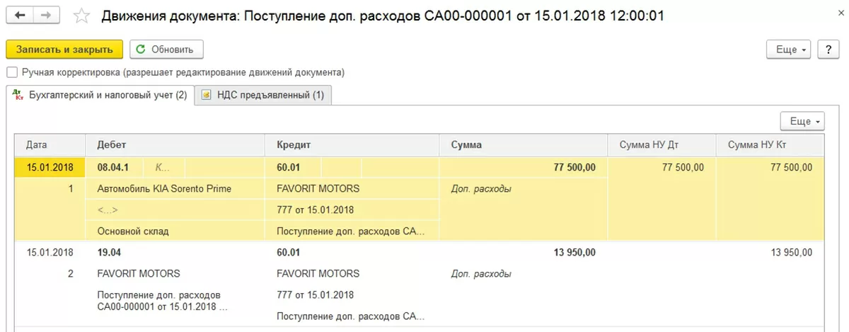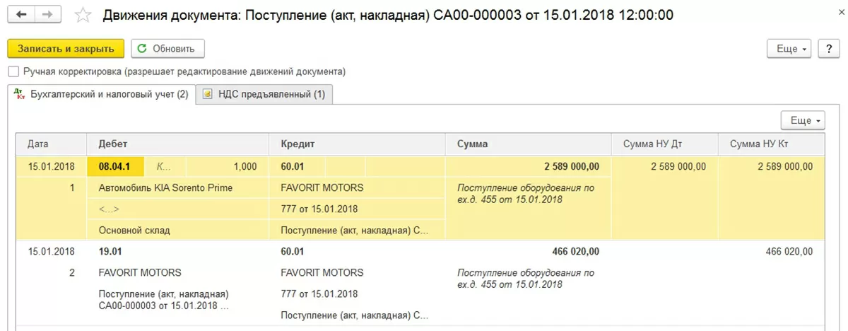 - Счет учета и счет НДС подставились по умолчанию по данным регистра сведений «Счета учета номенклатуры» и могут быть изменены.