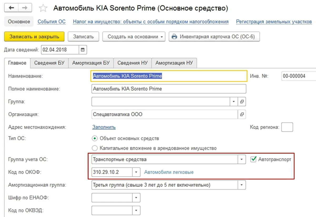 На закладке «Основные средства» потребуется добавить новую строку и создать новый элемент справочника «Основные средства», в котором указать не только наименование объекта, но и группу учета объектов ОС и заполнить код ОКОФ.