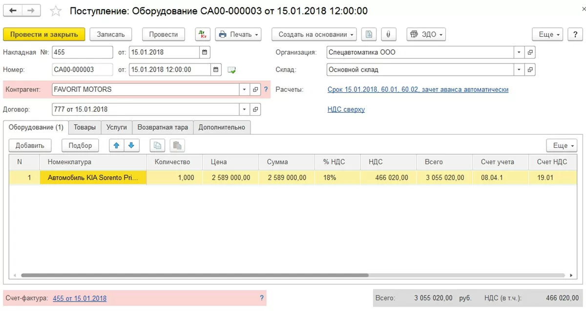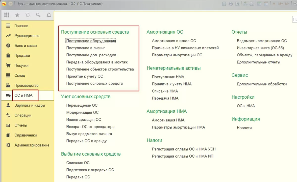 Для регистрации покупки таких ОС используют «Поступление оборудования/ОС и НМА» в главном меню системы.