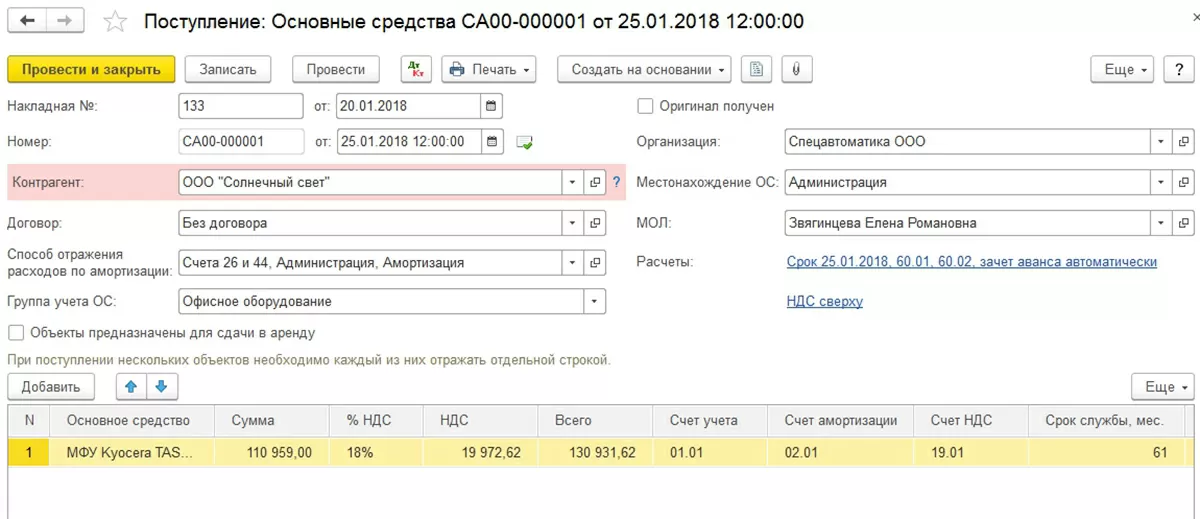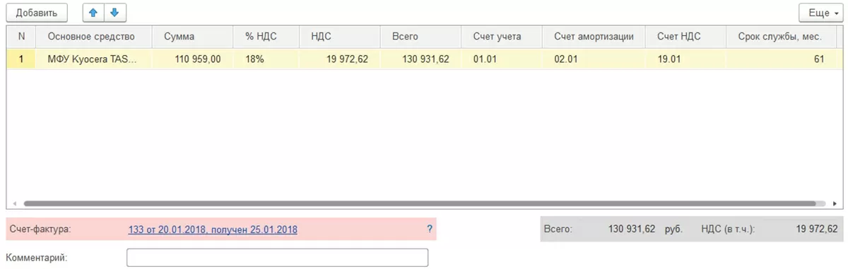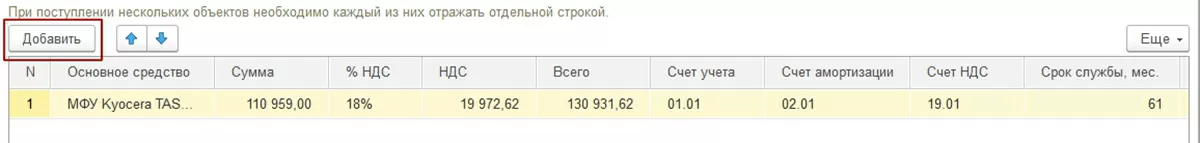 Завершается заполнение табличной части указанием стоимости основного средства, ставки НДС, срока полезного использования.