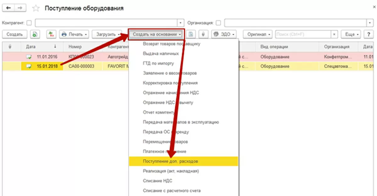 Для этого в списке документов поступления оборудования находим нужный документ, делаем его текущим и по кнопке «Создать на основании» выбираем из предложенного списка документ «Поступление доп. расходов».