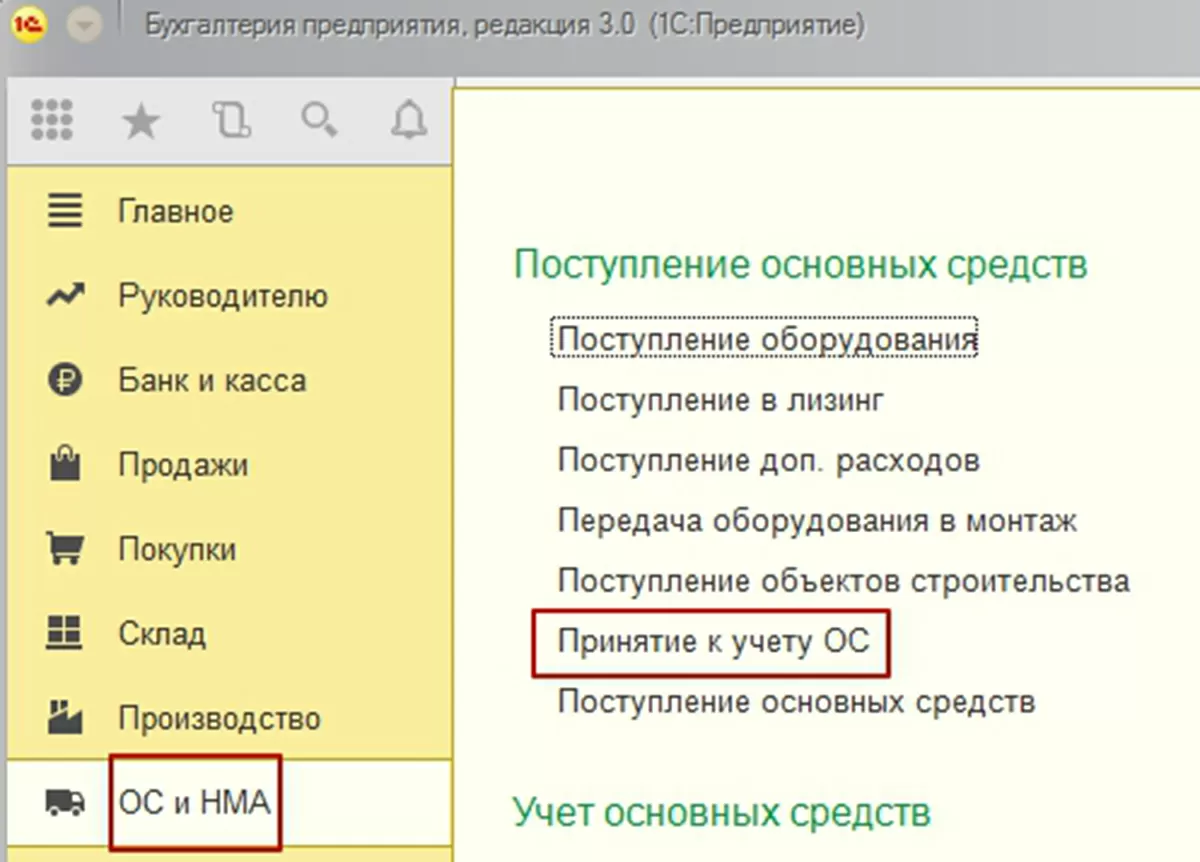 Основное средство, готовое к использованию и эксплуатации, сразу после покупки регистрируется в 1С 8.3 в «Поступлении основных средств», доступном из раздела «ОС и НМА» главного меню системы.