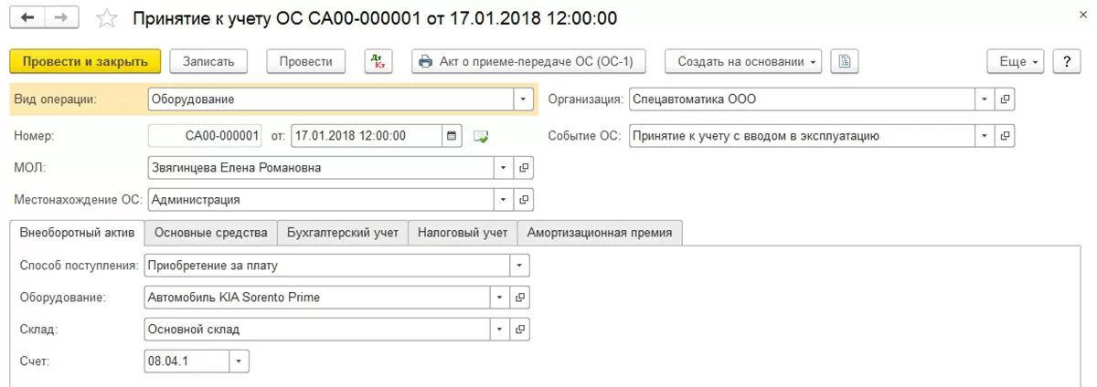 - Материально-ответственное лицо, как физическое лицо, получающее ОС – выбирается из справочника;